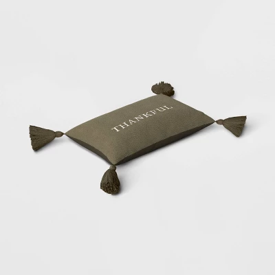 This Oversize ‘Thankful’ Embroidered Herringbone Lumbar Throw Pillow from Threshold™ will give your living room or sitting space a welcoming fall vibe. The decorative throw pillow is adorned with an embroidered white script that reads “Thankful” on a herringbone-textured background in dark green and matching tassels on the corners to accessorize your furniture for festive gatherings and celebrations. Featuring a 100% cotton exterior with soft filling, the oversized lumbar throw pillow adds that extra amount of comfort and style to your sofa, chair or bench.